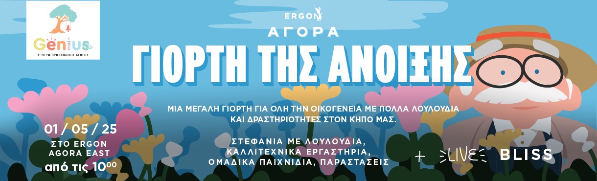 Την Πρωτομαγιά, την Πέμπτη 1 Μαΐου 2025, από τις 10.00 το πρωί, ο κήπος του Ergon Agora East στα Ανατολικά της Θεσσαλονίκης μεταμορφώνεται σε μια ανθισμένη γιορτή που υποδέχεται όλη την οικογένεια! Ένα ξεχωριστό event που γιορτάζει την άνοιξη με δημιουργικά εργαστήρια, ομαδικά παιχνίδια, live μουσική, παραστάσεις και πολλές εκπλήξεις, ακριβώς μπροστά στη θάλασσα. Ελάτε να ζήσετε μια αξέχαστη ημέρα γεμάτη χρώματα, γέλια και δημιουργία!